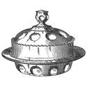 The general dimensions of the piece are: 6" tall with lid, 2" tall by 7 1/2" wide base, 4" tall by 5 1/2" wide lid.